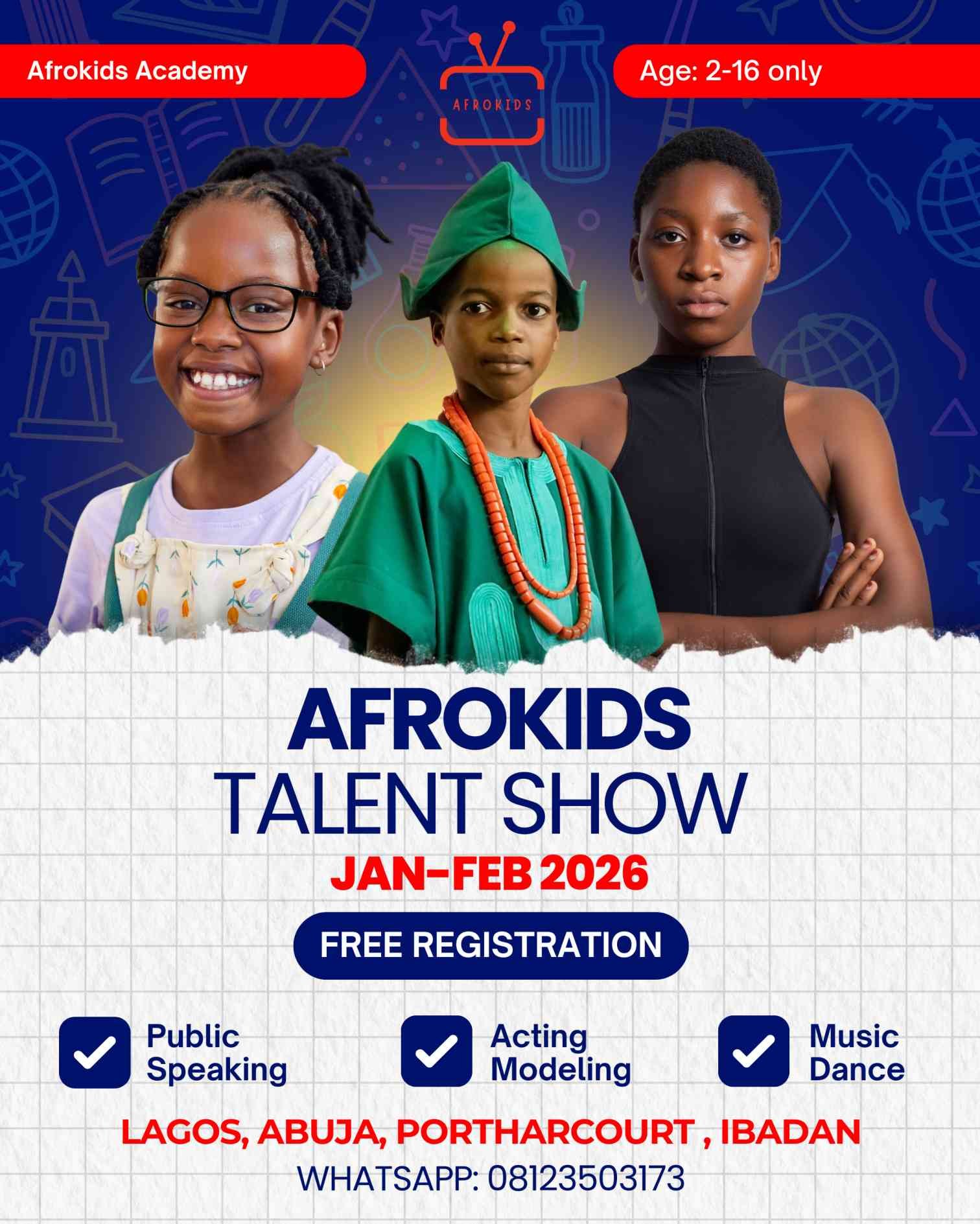 Register your child for the Afrokids Talent showcase and nurturing program. FREE for one month in Lagos, Abuja, Portharcourt and Ibadan. Age 2-16 only!